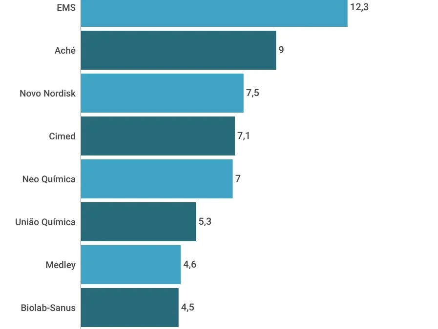 Três farmacêuticas brasileiras lideram na lista das dez maiores fabricantes no setor. Eurofarma (R$ 13,8 bilhões), EMS (R$ 12,3 bilhões) e Aché (R$ 9 bilhões) despontam na liderança. Na sequência vêm Novo Nordisk, Cimed e Neo Química, todas na casa dos R$ 7 bilhões. União Química, Medley, Biolab-Sanus e Nestlé fecham a relação.