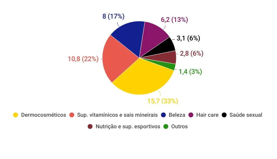 O incremento, apesar de menor em relação ao período anterior, quando a alta chegou a 16,4%, permitiu que o segmento ultrapasasse a marca de R$ 48 bilhões. Essa quantia foi conquistada principalmente pela venda de dermocosméticos, responsáveis por 33% da receita, seguida pelos suplementos vitamínicos e sais mineirais (22%) e pelo mix de produtos de beleza, com 16,6%.