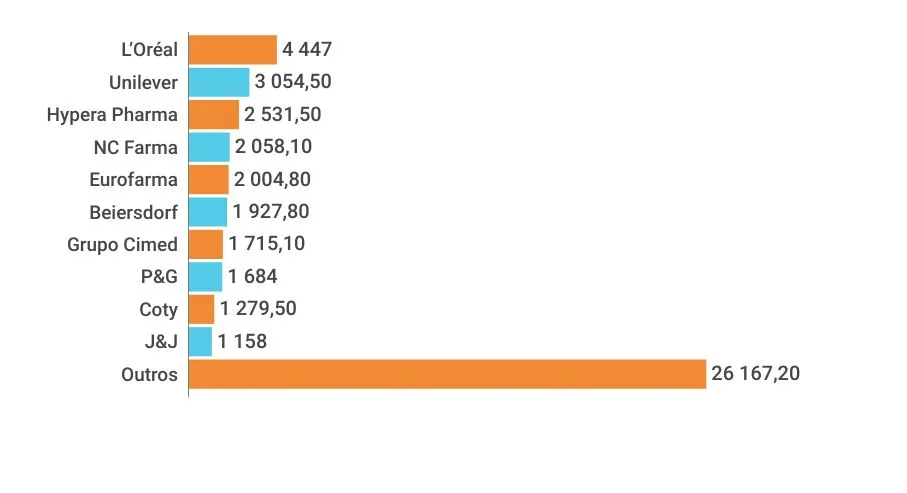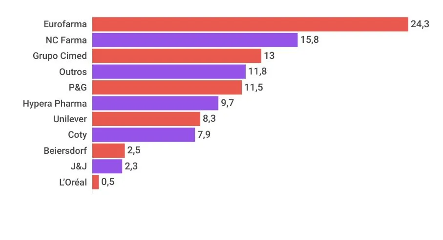 O relatório ainda classifica as principais corporações do setor, revelando as líderes de faturamento e crescimento no segmento. Enquanto L’Oréal, Unilever e Hypera formam o pódio, movimentando mais de R$ 10 milhões, a Eurofarma é a que mais avança, expandindo sua receita em 24,3%.