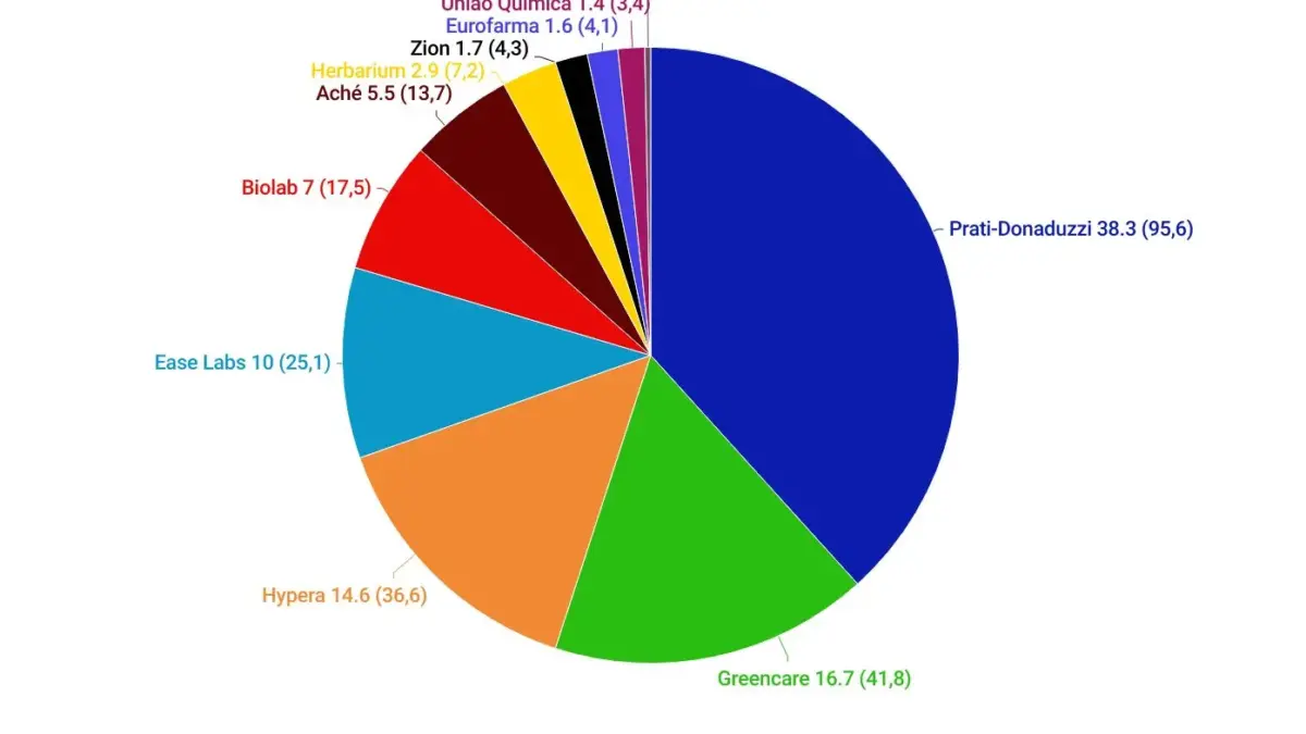 Entre as indústrias, o principal destaque é a Prati-Donaduzzi, que detém 38,3% de participação em um mercado de R$ 250 milhões. Empresas de menor porte, como Greencare, Ease Labs e Zion, também se destacam.
