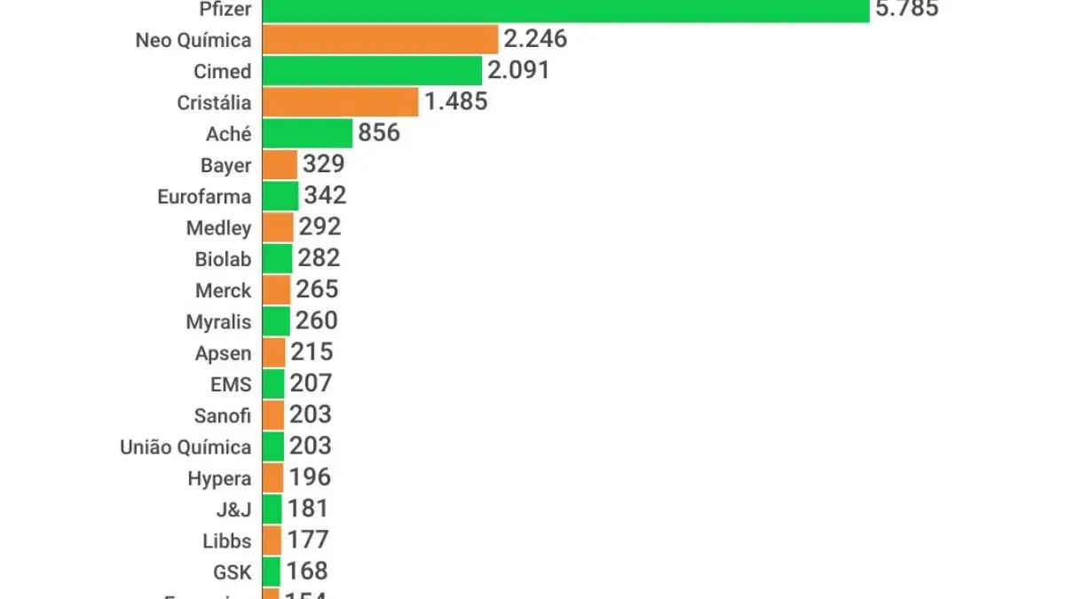 O ranking revela vantagem expressiva da Pfizer na primeira posição, com uma pontuação mais que duas vezes superior à da Neo Química, que aparece em segundo lugar.