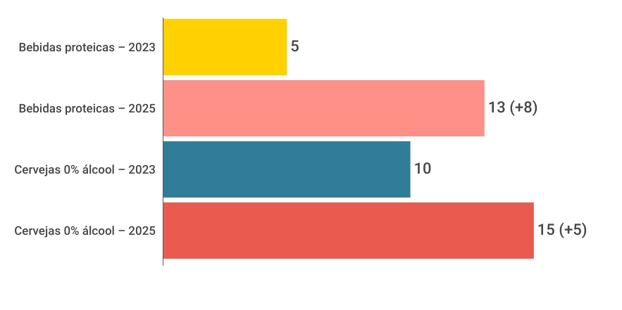 As bebidas proteicas ampliaram rapidamente sua presença nos lares brasileiros, passando de 5% de penetração em 2023 para 13% em 2025. Já as cervejas 0% álcool também avançaram de forma consistente, saindo de 10% para 15% no mesmo período.